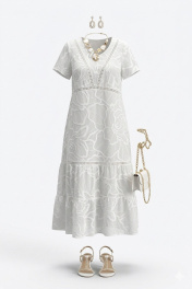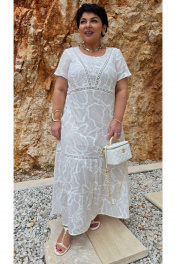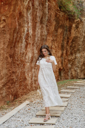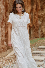 Каждая деталь этого платья пронизана нежностью и шармом. Платье позволяет каждой женщине, носившей его, ощущать себя неотразимой. Оно является идеальным выбором для летних встреч, прогулок по берегу моря или романтических свиданий в парке. Украсит любую фигурку, а вставки из кружева добавят образу романтики. Платье, расклешённое к низу, на подкладке. По переду расположены конструктивные вытачки и фигурная вставка с намёком на декольте на лифе с декоративным кружевом, округлый подрез на завышенной талии с кружевной тесьмой, в нижней части расположены удобные карманы, горизонтальный подрез с кружевной тесьмой и воланы. По спинке в верхней части расположен средний шов с обработанной застёжкой на навесную петлю с пуговицей, горизонтальные подрезы с кружевной тесьмой и воланы. Рукав втачной с вертикальной вставкой из кружевной тесьмы. Длина платья 130 см(р.50-54), 130,5 см (р.56-60). Длина рукава 21 см(р.50-54), 21,5 см (р.56-60). Платье 50 52 54 56 58 60 обхват груди 107 111 115 119 123 127 обхват талии 105 109 113 117 121 125 ширина изделия по линии бедер 126 130 134 138 142 146 ширина рукава вверху 39 41 43 45 47 49