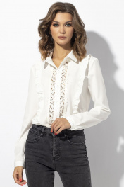 "Блуза женская делового стиля прямого силуэта. Перед с центральной застежкой на пуговицы по всей длине, с вертикальным рельефом и рюшей. В планку по обе стороны вставлено кружево. Спинка цельная. Блуза с рубашечным воротником, притачной стойкой. Рукав втачной с притачной манжетой, застегивающейся на пуговицу. Длина изделия: (р.44, 46, 48) - 61см. Длина рукава: (р.44, 46, 48) - 63см. Длина изделия: (р.50, 52, 54) – 61см. Длина рукава: (р.50, 52, 54) – 62см. Длина изделия: (р.56, 58, 60) – 64см. Длина рукава: (р.56, 58, 60) – 62см. Уход: ручная стирка при температуре не выше 30 С."
