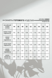 Блузка женская, полуприлегающего силуэта. Перед цельный с нагрудными выточками. Горловина V-образной формы с рюшей. Спинка цельная. Рукав втачной из двух частей, по центру с настроченным кружевом. Низ рукава на эластичной тесьме. Длина изделия (р.44, 46, 48): 59 см. Длина изделия: (р.50, 52, 54): 63 см. Длина изделия: (р.56, 58, 60): 64 см. Длина рукава: 62 см. Уход: ручная стирка при температуре не выше 30 С.
