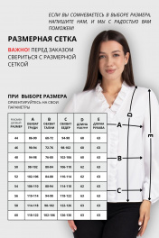 Блуза женская прямого силуэта. Перед из двух частей с нагрудными выточками. Спинка цельная. По центру переда и горловине вставлена рюша. Рукав втачной по низу на эластичной тесьме. Длина изделия (р.44, 46, 48): 60см. Длина рукава (р.44, 46, 48): 63см. Длина изделия (р.50, 52, 54): 62см. Длина рукава (р.50, 52, 54): 63см. Длина изделия (р.56, 58, 60): 63см. Длина рукава (р.56, 58, 60): 63см. Уход: ручная стирка при температуре не выше 30 С.