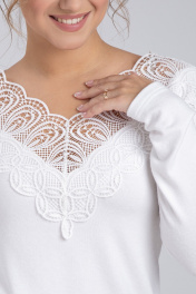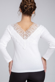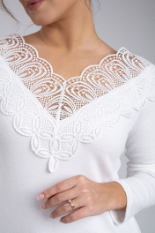 Джемпер женский полуприлегающего силуэта. Перед и спинка цельные. Отделочным элементом является кружево настроченное по переду и спинке горловины. Рукав реглан. Длина изделия различается в зависимости от выбранного размера. Для размеров 44, 46, 48 длина составляет 61 см, для размеров 50, 52, 54 - 62 см. Рукав джемпера имеет длину 62 см. Уход: бережная стирка при температуре не выше 30°С.