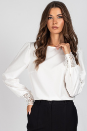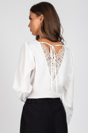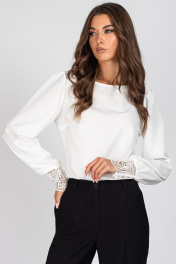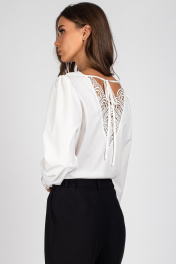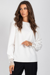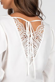 Блузка женская, полуприлегающего силуэта. Передняя часть блузки с нагрудными выточками. Спинка со вставкой из кружева и с завязками. Рукав втачной присборенный по окату и низу, с притачной манжетой, выполненной из кружева. Манжета застегивается на 4 навесные петли и пуговицы. Уход: бережная стирка при температуре не выше 30°С.