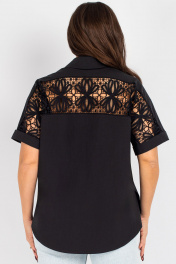 Блузка-рубашка женская прямого силуэта со спущенным плечом. Передняя часть рубашки состоит из двух частей, с центральной бортовой застежкой на 6 петель и пуговиц. На переде настрочены карманы. Спинка с отрезной кокеткой и с вставкой из кружева, переходящее на рукав. Рукав короткий с отворотом. Уход: бережная стирка при температуре не выше 30°С.