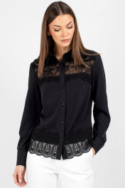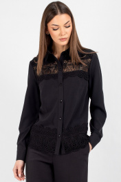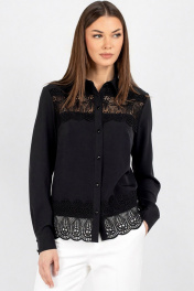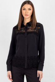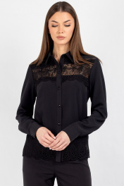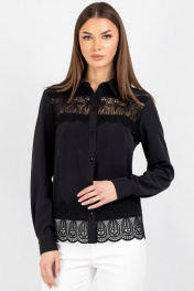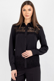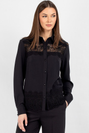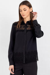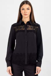 Женская блузка полуприлегающего силуэта, сочетающая строгость кроя с изысканными акцентами. Передняя часть c нагрудными выточками, обеспечивающими комфортную посадку. Центральная бортовая застёжка — на 6 или 7 пуговиц (в зависимости от размера), придаёт образу классическую завершённость. Особое внимание привлекает кружево, изящно нашитое в верхней и нижней части переда — оно добавляет лёгкости и утончённости, делая блузку особенно женственной. Спинка цельнокроеная, без дополнительных швов, что подчёркивает чистоту силуэта. Рукава втачные, с элегантной линией плеча. Низ рукава оформлен притачной манжетой, застёгивающейся на две пуговицы — аккуратный акцент, подчёркивающий запястья и гармонирующий с кружевными деталями. Воротник рубашечного типа с отрезной стойкой — строгий, но изящный элемент, который придаёт изделию архитектурную чёткость и завершённость. Его форма удачно балансирует между классикой и романтичным стилем. Уход: бережная стирка при температуре не выше 30°С.