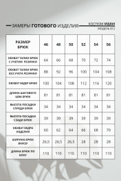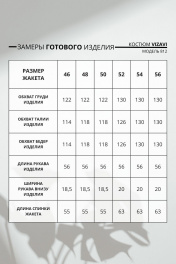 Костюм женский изготовлен из трикотажного полотна, состоит из жакета и брюк. Жакет прямого силуэта с однобортной застёжкой на потайные кнопки. Линия плечевого шва спущена, рукав широкий на притачной манжете с разрезом. По низу изделия кулиса. По горловине отложной воротник на отрезной стойке. Брюки прямого силуэта по линии талии пояс с резинкой 4см. Уход: бережная стирка при температуре не выше 30°С.