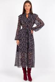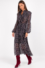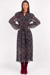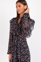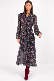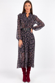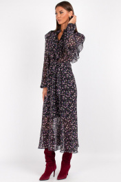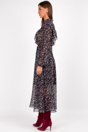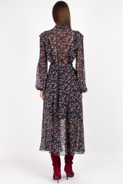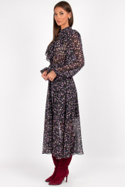 Платье женское полуприлегающего силуэта, отрезное по линии талии на резинке. Передняя часть платья с нагрудными вытачками, швом посередине, с кокеткой и вставленной в нее рюшей. Перед с застежкой на 3 навесные петли и пуговицы. Спинка с рельефом. В рельефы вставлена рюша, переходящая с переда. Юбка платья - полусолнце на подкладке. Рукав втачной одношовный со сборкой у оката. Низ рукава на резинке. Воротник - стойка. По талии завязывающейся пояс. Уход: бережная стирка при температуре не выше 30°С.