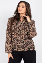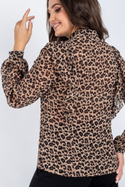Блузка полуприлегающего силуэта. Полочка с нагрудными выточками, фигурной кокеткой в шов которой вставлена рюша, переходящая на спинку. По переду застежка на 3 навесные петли и декоративные пуговицы. Рукав втачной, со сборкой по окату. Низ рукава на резинке. По горловине воротник - стойка. Уход: бережная стирка при температуре не выше 30°С.