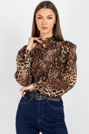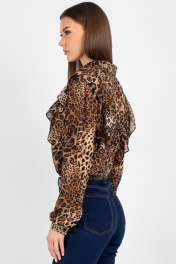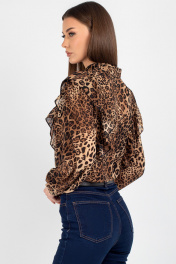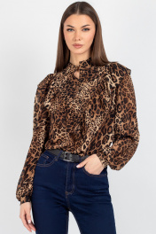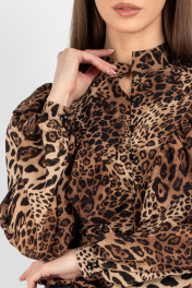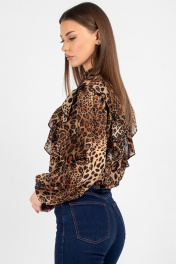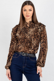 Женская блузка с леопардовым принтом и рюшами Эта модель идеально подойдёт для офиса, создания романтичного, но уверенного образа — будь то деловая встреча или вечерняя прогулка. Полочка с нагрудными выточками обеспечивает комфортную посадку и подчёркивает линию груди. Фигурная кокетка украшена рюшей, плавно переходящей на спинку — изысканный акцент, придающий образу динамику. Застёжка на три навесные петли с декоративными пуговицами по переду добавляет шарм. Втачные рукава со сборкой по окату создают объём и воздушность, а низ на резинке мягко фиксирует рукав, не сковывая движений. Воротник-стойка подчёркивает линию шеи и добавляет нотку строгости, уравновешивая леопардовый принт. Блузка с длинным рукавом выполнена из ткани с принтом. Идеально сочетается с кожаными брюками, юбками и классическими джинсами. Уход: бережная стирка при температуре не выше 30°С.