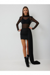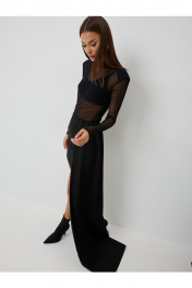 Гольф: – полуприталенный силуэт – воротник-стойка – рукав втачной одношовный – плечевые накладки Юбка: – приталенный силуэт – потайная молния – со шлейфом.