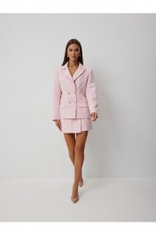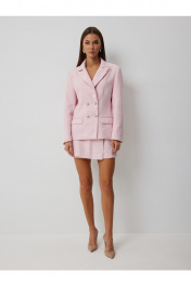 Пиджак: – приталенный силуэт – на подкладке – двухбортный – подплечники – воротник-стойка, переходящий в V-образный вырез – рукав втачной двухшовный – горизонтальные прорезные карманы с клапаном – спинка со средним швом Юбка-шорты: – на подкладке – потайная молния – полуприталенный силуэт – пояс на обтачке.