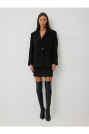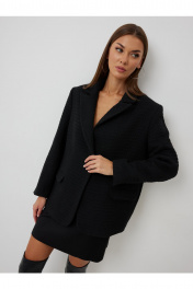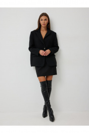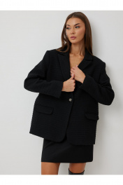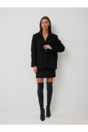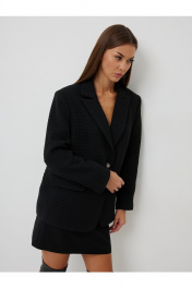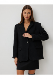 Жакет: – приталенный силуэт – на подкладке – двухбортный – подплечники – воротник-стойка, переходящий в V-образный вырез – рукав втачной, двухшовный – горизонтальные прорезные карманы с клапаном.
