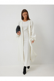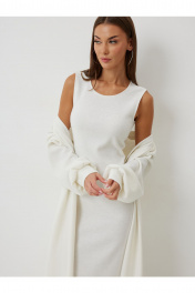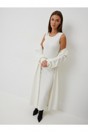 Кардиган: - свободный силуэт - рукав одношевный - V-образный вырез Платье макси: – приталенный силуэт – потайная молния по середине спинки – разрез снизу по спинке – без рукавов – овальная горловина.