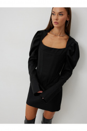 Корсет: – прилегающий силуэт – фигурный вырез горловины – по передней части изделия и в боковых швах — упругие узкие пластины – застёжка по спинке: петля-пуговица и шнуровка – рукав втачной, буф – по низу рукава — манжет с разрезами – на подкладке Юбка: – прямой силуэт – застёжка на потайной молнии по спинке – на подкладке.