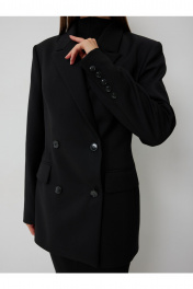Жакет: – свободный силуэт – на подкладке – рукав втачной, двухшовный; на рукаве петли-пуговицы – застёжка петли-пуговицы – двухбортный – карманы по переду с клапаном – воротник пиджачного типа.