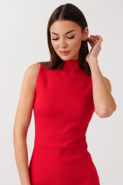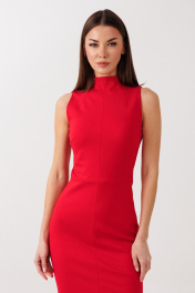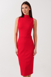 Платье миди (ткань джерси): – приталенный силуэт – потайная молния по середине спинки – разрез снизу по спинке – без рукавов – горловина-стойка.