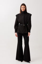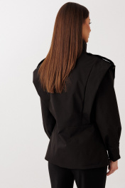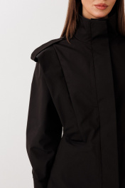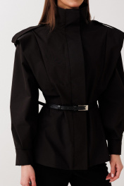 "Ветровка: -свободного силуэта, -воротник стойка - функциональные карманы в боковых швах, -выполнены из костюмной ткани черного цвета, - застёжка петли пуговицы и брючная молния, -съемный ремень в комплекте "
