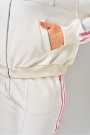 Джемпер: - свободный силуэт - воротник стойка - прорезные функциональные карманы - втачной спущенный рукав, – застежка молния, -декоративные элементы, в виде кармашка на груди и лампас по бокам рукава. Брюки: – прямой силуэт –функциональные карманы в боковых швах, – пояс с эластичной тесьмой и завязками – по боковому шву брюк лампасы.