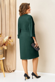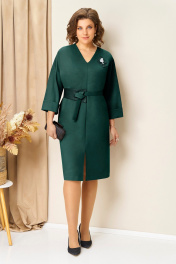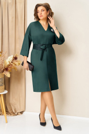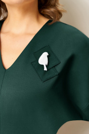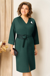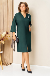 Элегантное лаконичное платье из эластичного трикотажа прямого полуприлегающего силуэта с акцентной V-образной горловиной. Центральный элемент отделки платья- вставки из кожи и необычная съемная брошь для легкости образа. Длина платья немного за колено, уместная в большинстве ситуаций. Спереди небольшой вырез для максимального удобства. Длина платья по центру спинки- 104см. Декоративный и функциональный пояс- в комплекте изделия.