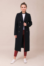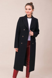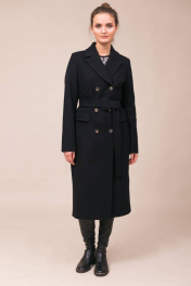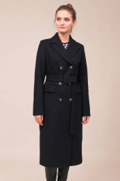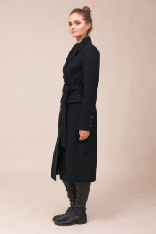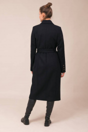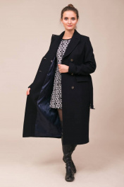 Пальто демисезонное, полуприлегающего силуэта с втачными рукавами и длиной "миди". По переду двубортная застежка на петли и пуговицы, талиевые вытачки , а также прорезные карманы с клапаном. Пальто с отрезным бочком. Спинка с центральным швом, В области талии расположены шлевки. Рукав втачной, двухшовный с втачной шлицей, на которой расположены пуговицы. Воротник стояче-отложной пиджачного типа с отрезной стойкой. В качестве декора по краю борта, лацканам, воротнику и клапанам прострочена отделочная строчка. Пальто дополнено поясом Состав: 80% шерсть, 20%полиэстер. подкладка: 50% вискоза, 50% полиамид