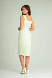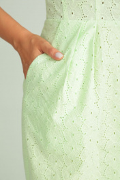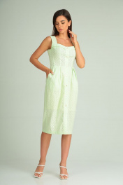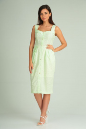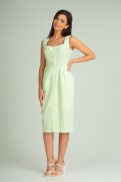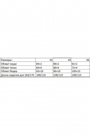 Сарафан женский приталенного силуэта, зауженный к низу, с центральной застежкой на пуговицы. Отрезной по линии талии. На широких бретелях. В нижней части изделия карманы в боковых швах. На передних частях юбки мягкие складки. Нижняя часть платья на подкладке. Длина изделия от плеча 108 см (для роста 164 см)/ 110 см (для роста 170 см)