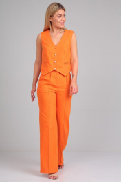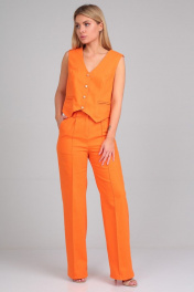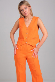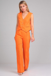 Костюм женский, состоящий из жилета и брюк. Жилет прилегающего силуэта, с отрезными бочками по полочке и спинке. На полочках расположены прорезные карманы в рамку. Фигурно оформлен по низу. Застегивается на пуговицы. Длина жилета от плеча по спинке для роста 164 см 46 см, для роста 170 см 47 см. Брюки расклешенные от линии колена к низу. По бокам расположены карманы. На поясе расположены шлевки. Застежка на молнию и пуговицу. Длина брюк от пояса 105 см для роста 164 см, 107 см для роста 170 см.