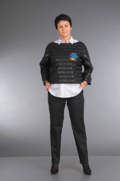 Брючный костюм, тройка. В брючном комплекте рубашка выполнена из тонкой хлопковой ткани, свитер - из плотного трикотажа, брюки из стрейчевой текстильной ткани. Свитер декорирован декоративным карманом. Длина рубашки 74 см. Длина свитера по спинке 51 см, длина рукава 57 см от горловины. Длина брюк 94 см.