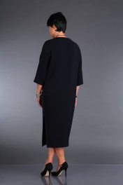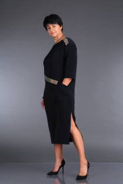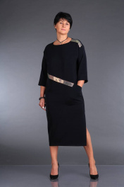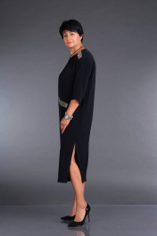 Платье женское прямое .заужено к низу из костюмной ткани (анжелики). По переду платье сложнорасчлененное из трех частей .На верхней правой части одна нагрудная выточка,выходящая из проймы.На левой нижней части накладной карман. Перед декорирован настрочной тесьмой из пайеток. Спинка цельная с двумя плечевыми выточками из горловины. В левом боковом шве предусмотрен разрез.Плечо спущено.рукав одношовный втачной,длина ¾.Горловина круглая ,обработана обтачкой.