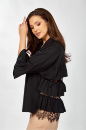 Элегантный, женский комплект сочетающий в себе утонченность и современный стиль. Блуза из легкой хлопковой ткани с многослойными рюшами и кружевными вставками по спинке и низу. Полупрозрачные элементы придают образу изысканность и воздушность. Рукав с воланом по низу, длиной 7/8. Брюки с высокой посадкой свободного кроя, выполненные из мягкой костюмной ткани. Пояс притачной с резинкой по спинке и центральной застежкой молнией спереди. Идеально подчеркивают силуэт и создают визуальный баланс с декоративным верхом. Цветовая гамма: черный верх + бежевый низ-универсальное сочетание для любого сезона. Модель подходит для вечерних выходов, романтичных встреч и стильных фотосессий. Ткань: хлопок, вискоза, кружево. Длина блузы 71-72см., длина рукава от горловины 54 см., длина брюк 104-105см. Декор может отличаться от представленного на фото.