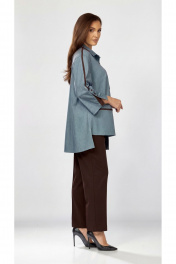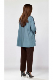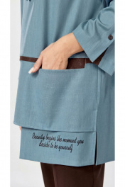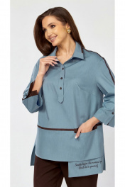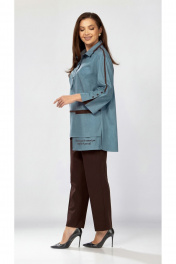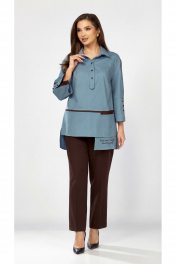 Стильный двухцветный комплект в офисно-повседневном духе-удлинённая голубая туника с декоративными шоколадными вставками и прямые брюки шоколадного цвета. Удобный, лаконичный образ для работы и прогулок. Состав и фактура-лёгкая костюмная ткань (вискоза/полиэстер) — хорошо держит форму, не мнётся сильно. Верх-удлинённая туника с отложным воротником, планкой с пуговицами, трёхчетвертным рукавом с декоративными пуговицами и прорезями по бокам. Контрастная тёмно-коричневая тесьма вдоль талии и на рукавах. Низ-классические прямые брюки длины «анкл» в насыщенном шоколадном цвете, с удобной посадкой по фигуре. - Детали-лёгкий асимметричный разрез по низу туники, декоративная печать на удлиненном кармане, аккуратные строчки и отделка контрастной тесьмой. Декор и фурнитура могут отличаться от представленных на фото.