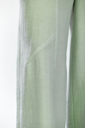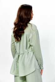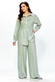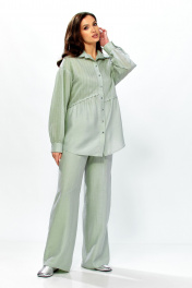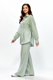 "Нежный женский костюм в мягком фисташковом оттенке,созданный для максимального комфорта и легкости образа. Верх-удлиненная рубашка свободного кроя на пуговицах,с классическим воротникои и аккуратной линией плеч. Верхняя часть отделана тканью в полоску,ниже линии подреза ткань драпируется,создавая легкий,струящийся силуэт. Обьемные рукава на манжете добавляют образу воздушности. Брюки прямого силуэта,поддерживают общий расслабленный стиль костюма и визуально вытягивают фигуру. Такой комплект идеально подойдет для повседневных образов,путешествий и встреч в неформальной обстановке. Он смотрится стильно и ощущается как любимая домашняя одежда."